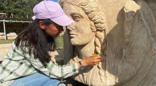 Muğla'nın Yatağan ilçesindeki Strakonikeia Antik Kenti'nde yürütülen kazı çalışmalarında bulunan Yunan tanrısı Dionysos'un eşi Ariadne'nin maskının arkeologlar ile restoratörler tarafından temizliği yapılıyor.