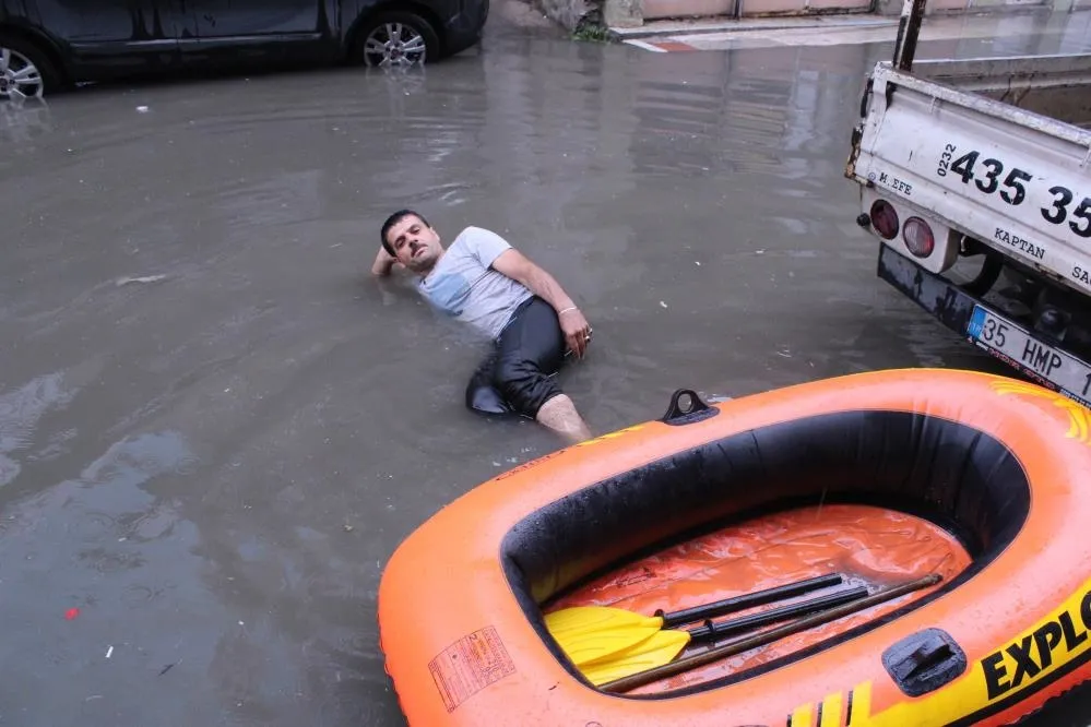 Bornova ilçesinde bir esnaf, su birikintisi olan sokaktan kürek kullanarak botla geçti. Yıllardır aynı sorunları yaşadıklarını söyleyen Aşın, "Dükkanlarımızı su basıyor. Defalarca İzmir Büyükşehir Belediyesi ve Bornova Belediyesine sorunu ilettik ama ilgilenen olmadı. Bir an önce sorunun çözülmesini istiyoruz. Botla sokaktan geçtik, insanlara da yardım ettik. Her sene aynı manzara olduğu için botu dükkanda tutuyorum" dedi.