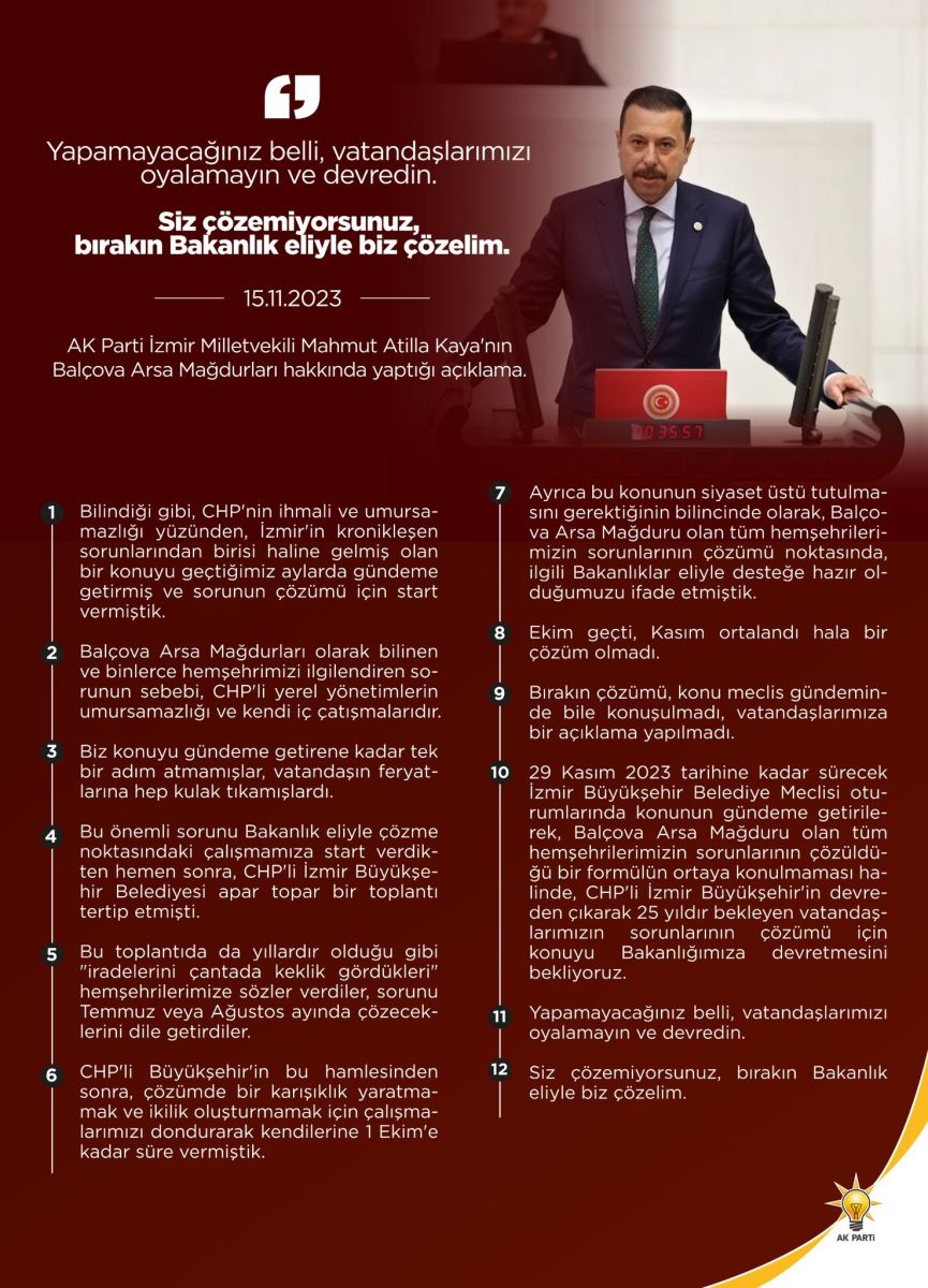 AK Parti İzmir Milletvekili Mahmut Atilla Kaya, "Bilindiği gibi, CHP'nin ihmali ve umursamazlığı yüzünden, İzmir'in kronikleşen sorunlarından birisi haline gelmiş olan bir konuyu geçtiğimiz aylarda gündeme getirmiş ve sorunun çözümü için start vermiştik. Balçova Arsa Mağdurları olarak bilinen ve binlerce hemşehrimizi ilgilendiren sorunun sebebi, CHP'li yerel yönetimlerin umursamazlığı ve kendi iç çatışmalarıdır. Biz konuyu gündeme getirene kadar tek bir adım atmamışlar, vatandaşın feryatlarına hep kulak tıkamışlardı. Bu önemli sorunu Bakanlık eliyle çözme noktasındaki çalışmamıza start verdikten hemen sonra, CHP'li İzmir Büyükşehir Belediyesi apar topar bir toplantı tertip etmişti. Bu toplantıda da yıllardır olduğu gibi "iradelerini çantada keklik gördükleri" hemşehrilerimize sözler verdiler, sorunu Temmuz veya Ağustos ayında çözeceklerini dile getirdiler. CHP'li Büyükşehir'in bu hamlesinden sonra, çözümde bir karışıklık yaratmamak ve ikilik oluşturmamak için çalışmalarımızı dondurarak kendilerine 1 Ekim'e kadar süre vermiştik. Ayrıca bu konunun siyaset üstü tutulmasını gerektiğinin bilincinde olarak, Balçova Arsa Mağduru olan tüm hemşehrilerimizin sorunlarının çözümü noktasında, ilgili Bakanlıklar eliyle desteğe hazır olduğumuzu ifade etmiştik. Ekim geçti, Kasım ortalandı hala bir çözüm olmadı. Bırakın çözümü, konu meclis gündeminde bile konuşulmadı, vatandaşlarımıza bir açıklama yapılmadı. 29 Kasım 2023 tarihine kadar sürecek İzmir Büyükşehir Belediye Meclisi oturumlarında konunun gündeme getirilerek, Balçova Arsa Mağduru olan tüm hemşehrilerimizin sorunlarının çözüldüğü bir formülün ortaya konulmaması halinde, CHP'li İzmir Büyükşehir'in devreden çıkarak 25 yıldır bekleyen vatandaşlarımızın sorunlarının çözümü için konuyu Bakanlığımıza devretmesini bekliyoruz. Yapamayacağınız belli, vatandaşlarımızı oyalamayın ve devredin.Siz çözemiyorsunuz, bırakın Bakanlık eliyle biz çözelim."