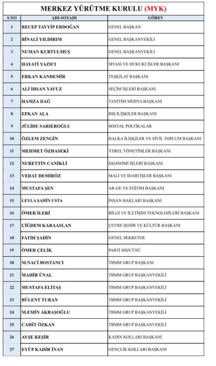 AKP Merkez Yürütme Kurulu'nun (MYK) yeni üyeleri atandı. Erdoğan, Binali Yıldırım ve Numan Kurtulmuş'u Genel Başkanvekili olarak belirledi.