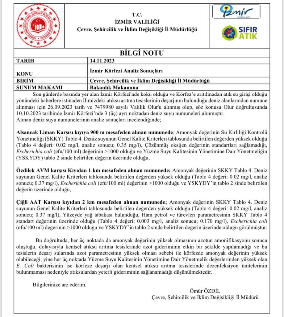 ‘’Körfez PR'larını bilim çökertti! Çevre, Şehircilik ve İklim Değişikliği İl Müdürlüğü'nün tetkik sonuçları, CHP'li Soyer'in açıklamalarını da yüzme gösterisini de yalanlayan nitelikte! Dış körfez - iç körfez farkını 4,5 yılda öğrenebilen Soyer; İzmirlileri de bundan bihaber sanıyor olmalı. Kendisini bir kez daha Konak, Alsancak, Bayraklı ya da Çiğli'den denize girmeye davet ediyoruz. Hiç kaygılanmasınlar; bir ambulans ve sağlık ekibi mutlaka orada olacaktır.’’