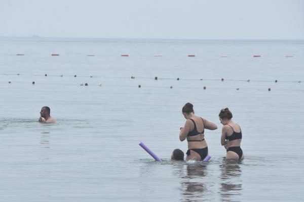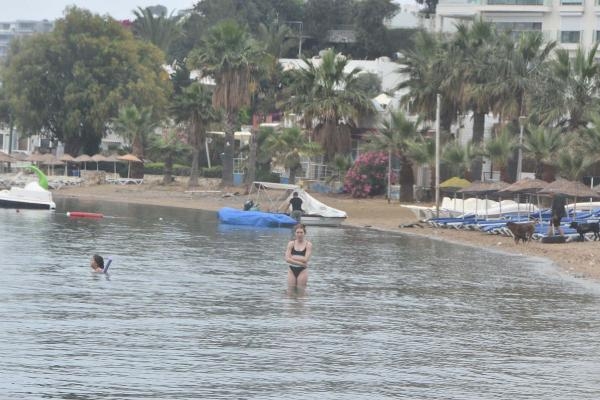 MUĞLA'nın Bodrum ilçesinde bazı yabancı turistler, zaman zaman sağanağa dönen yağmurda denize girdi.
