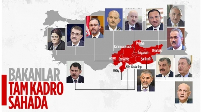 Yurt içinde yardım seferberliği başlarken, birçok ülke de yardım ve kurtarma ekiplerini yola çıkardı. Bakanlar ise görevlendirildikleri afet bölgelerinde çalışmalarını aralıksız sürdürüyor. Depremin ilk anlarından itibaren bölgelere yönelen bakanların görev yerleri ise şu şekilde;