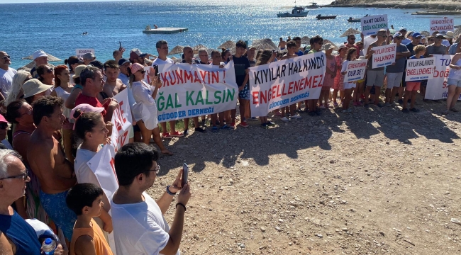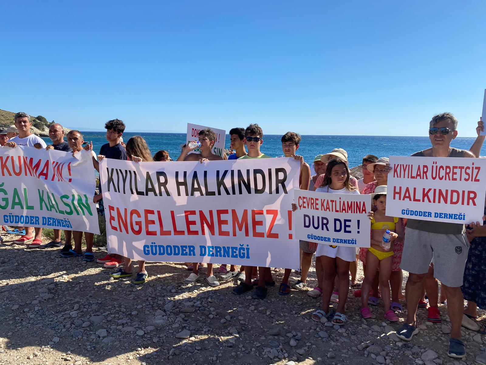 Çeşme’de ücretsiz halk plajlarından biri olan Gücücek Koyu’nun ihaleye çıkılmasına karşı insan zinciri oluşturan vatandaşlar ihalenin iptal edilmesi çağrısında bulundu.