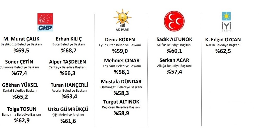 Başkan Çalık’ın ilçe belediye başkanları sıralamasında, birçok başarılı ve önemli ilçe belediyesini geride bırakarak birinci sırada yer aldığı araştırmada, Buca Belediye Başkanı Erhan Kılıç yüzde 68.7 oranla ikinci, Çukurova Belediye Başkanı Soner Çetin ise yüzde 67.4 oranla üçüncü sırada yer aldı. Avrasya Araştırma’nın Aralık 2020 simülasyonu, 2020 yılında başarılarıyla öne çıkan Büyükçehir İlçe Belediye Başkanları sıralamasında CHP’li ilçe belediye başkanlarının ön plana çıktığını da ortaya koydu.