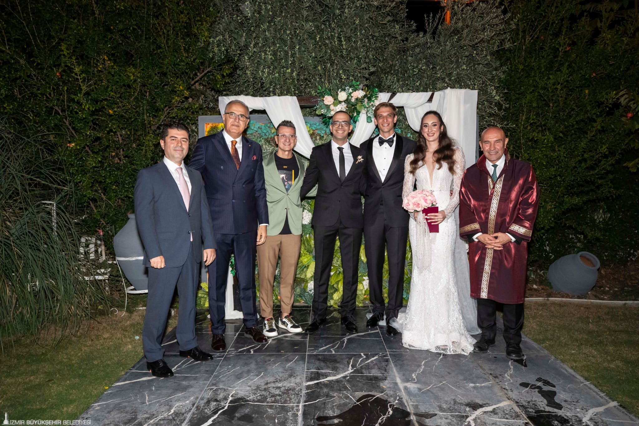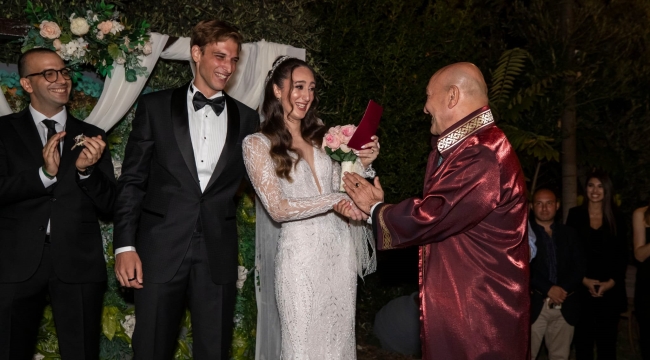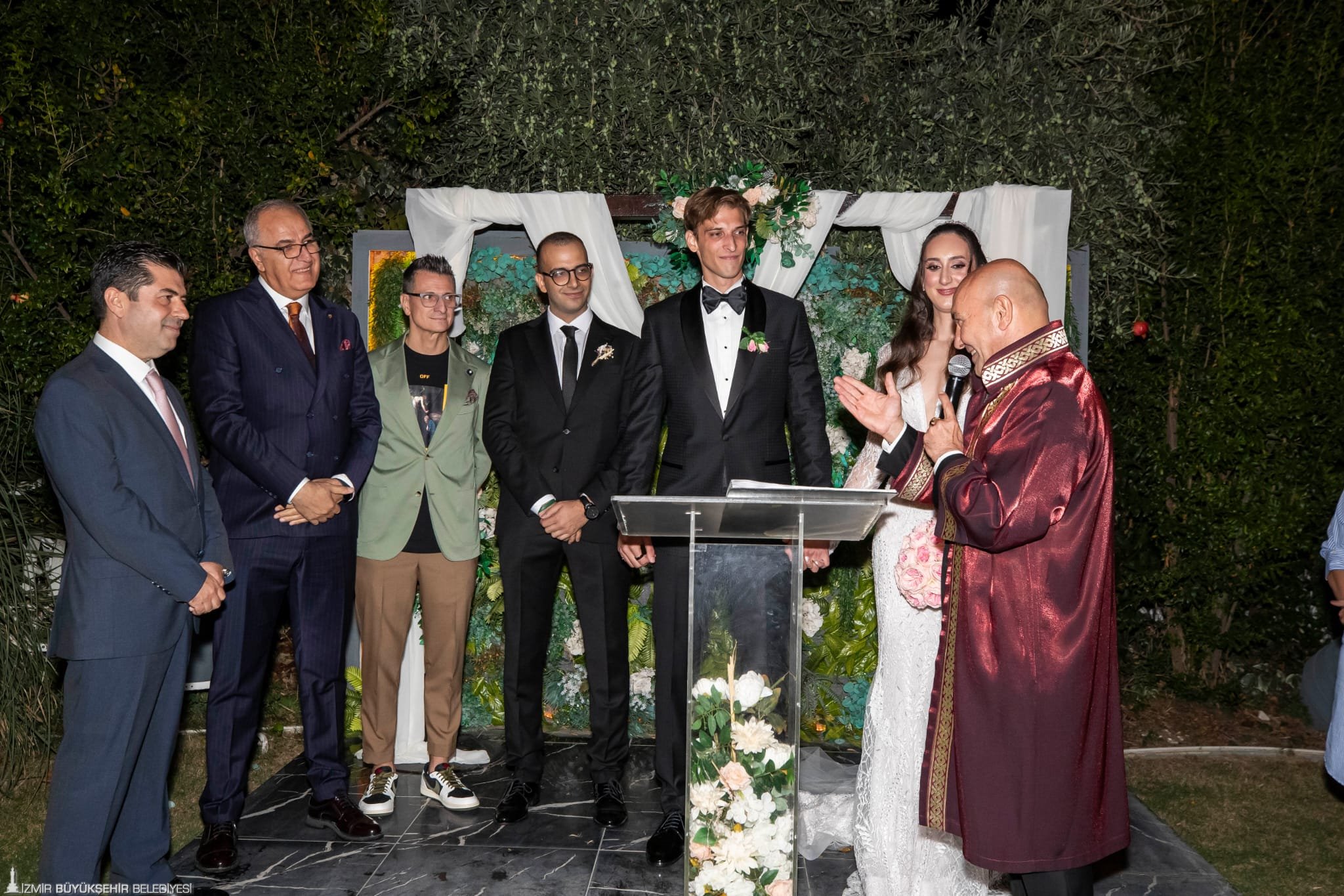 Narlıdere’deki Romarin Wedding & More’da düzenlenen nikah töreninde Başkan Tunç Soyer, Ayça Aykaç ve Mert Altıntaş’ın nikah akdini gerçekleştirirken çiftin şahitliğini Türkiye Voleybol Federasyonu (TVF) Başkanı Mehmet Akif Üstündağ, Vakıfbank Kadın Voleybol Takımı Başantrenörü Giovanni Guidetti, Vakıfbank Genel Müdür Yardımcısı ve Spor Kulübü Başkan Yardımcısı Ferkan Merdan ve Ata Gündüzalp yaptı.