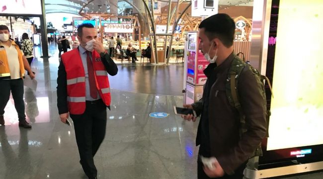 İstanbul Havalimanı Emniyet Şube Müdürü Hüseyin Ağca'nın katıldığı denetimlerde yerli ve yabancı yolcular, çalışanlar ile iş yeri sahiplerine maske ve sosyal mesafeye uyulması konusunda uyarılarda bulunuldu.