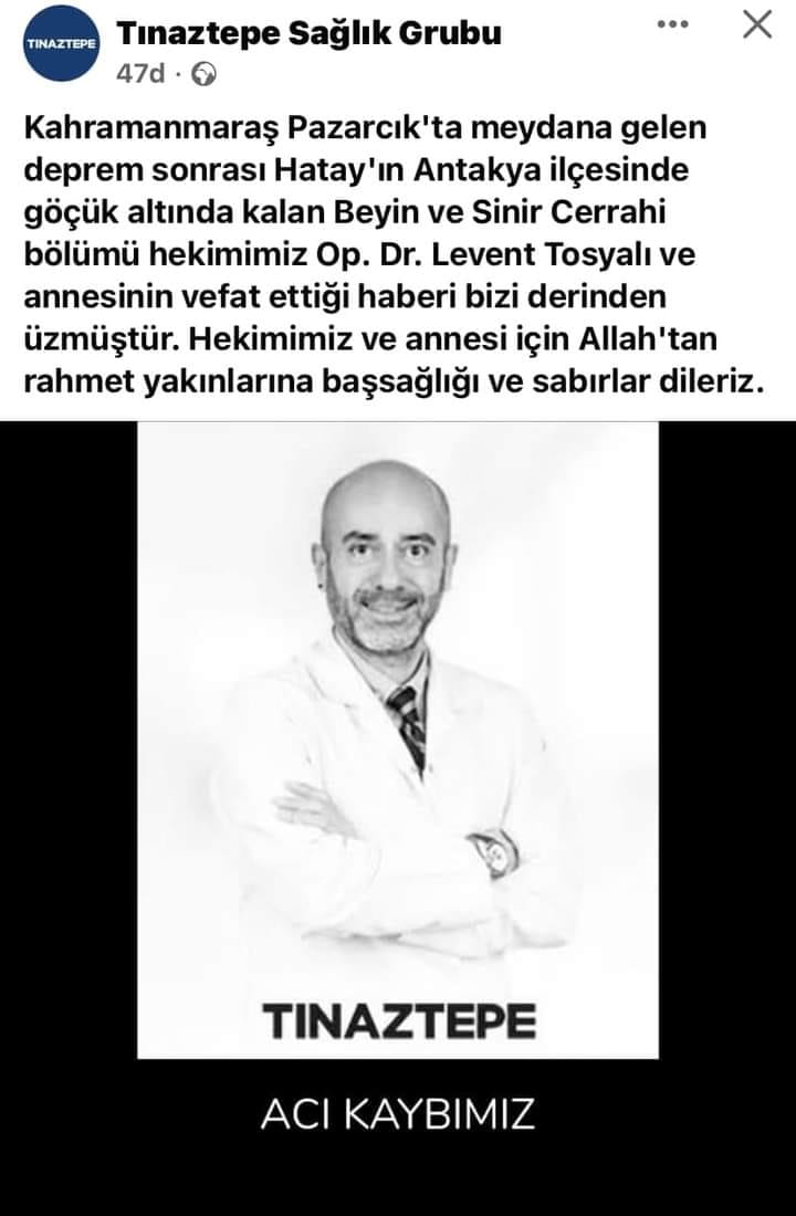 İzmir Tınaztepe Üniversitesi Özel Buca Tınaztepe Hastanesi Beyin ve Sinir Cerrahi bölümünde görevli, tanınmış cerrah emekli Hava Tabip Albay Op. Dr. Levent Tosyalı ve annesi depremde yaşamını yitirdi.