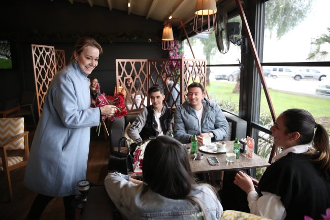 Bir sonraki durağı Güzelyalı Mahallesi olan CHP Konak Belediye Başkan Adayı Nilüfer Çınarlı Mutlu, 14 Şubat Sevgililer Günü dolayısıyla vatandaşlara sürpriz yaptı. CHP İzmir Eski Milletvekili Kani Beko, İlçe Kadın Kolları Başkanı Melda Erbaykent, İlçe Gençlik Kolları Başkanı Okan Uslu ve partili gençlerle birlikte alana inen Mutlu, semtin sokaklarında ve kafelerde çiçek dağıtımı gerçekleştirdi. Renkli görüntülere sahne olan etkinlikte Mutlu, Konak halkının Sevgililer Günü’nü kutladı.
