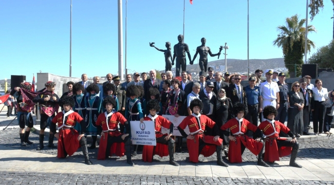 Atatürk Meydanı'nda saat 10.30'da başlayan törene; Kuşadası Kaymakamı İbrahim Keklik, Kuşadası Belediye Başkan Vekili Metin Uğur, Kuşadası Emniyet Müdürü Mehmet Ali Berksoy, İlçe Jandarma Komutan Vekili Üsteğmen Fatih Fuçular, Sahil Güvenlik Karakol Komutan Vekili Üsteğmen Emre Kaçak, İlçe Milli Eğitim Müdürü İbrahim Ataman, Kuşadası Şehit Aileleri ve Gazileri Derneği Başkanı Mehmet Yiğit, belediye meclis üyeleri ile şehit ve gazi yakınları katıldı. Törende şehitler için saygı duruşunda bulunuldu. Kuşadası Kaymakamı İbrahim Keklik ve Belediye Başkan Vekili Metin Uğur tarafından Atatürk Anıtı’na çelenk konulmasıyla başlayan tören İstiklal Marşı’nın okunmasıyla devam etti.