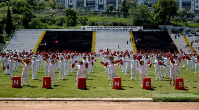 Özer Türk Stadı’ndaki programda, saygı duruşunda bulunulması ve İstiklal Marşı'nın okunmasının ardından Kuşadası Kaymakamı Sadettin Yücel ve Belediye Başkanı Ömer Günel, törene katılan öğrenciler ile vatandaşların bayramını kutladı. Günün anlam ve önemini belirten konuşmaların ardından dans ve jimnastik gösterileri sergilendi. Daha sonra Kuşadası Kaymakamı Sadettin Yücel, Belediye Başkanı Ömer Günel ve İlçe Milli Eğitim Müdürü İbrahim Ataman tarafından uluslararası turnuvalarda dereceye giren sporculara çeşitli hediyeler verildi. Kutlama programında lise öğrencileri tarafından okunan “Atatürk’ün Gençliğe Hitabesi ve Gençliğin Ata’ya Cevabı” Kuşadalılar tarafından ayakta alkışlandı.