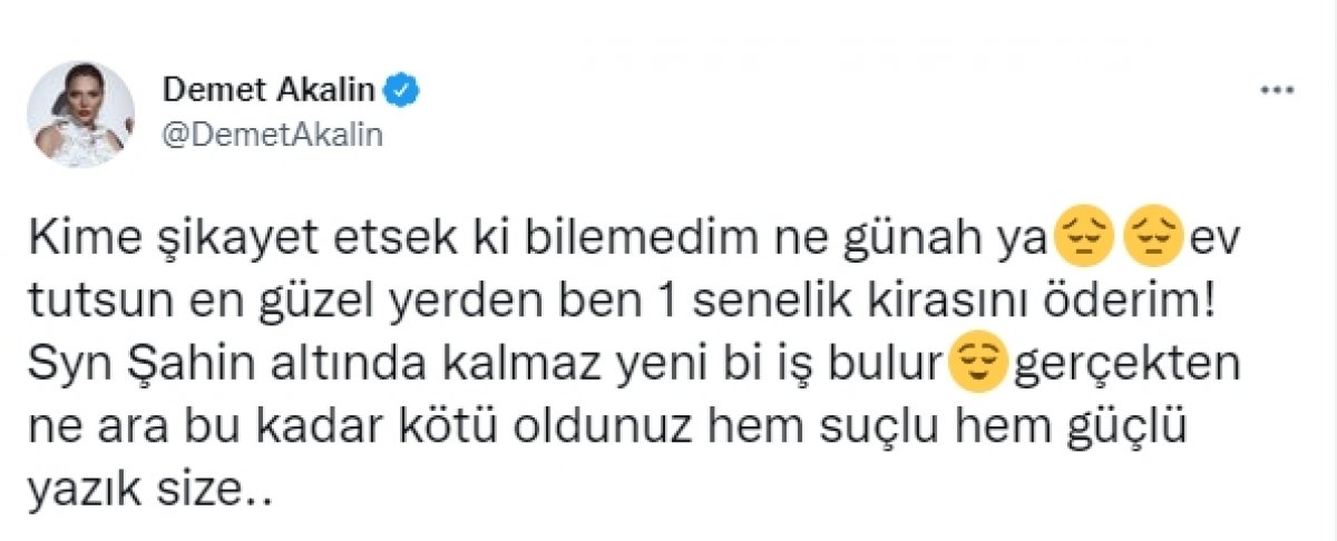 Gaziantep Büyükşehir Belediye Başkanı Fatma Şahin'e seslenen Akalın, "Kime şikayet etsek ki bilemedim ne günah ya. Ev tutsun en güzel yerden ben 1 senelik kirasını öderim! Syn Şahin altında kalmaz yeni bi iş bulur. Gerçekten ne ara bu kadar kötü oldunuz hem suçlu hem güçlü yazık size.." ifadelerini kullandı.