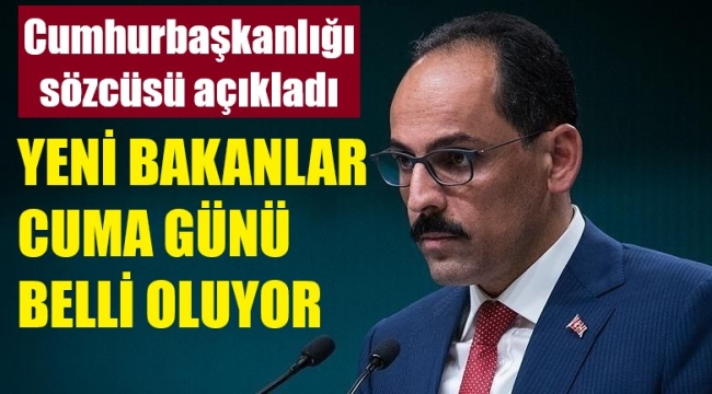 Cumhurbaşkanlığı Sözcüsü İbrahim Kalın, yeni Kabine için "Yemin töreni ve Kabine açıklaması cuma günü olabilir. YSK'nın kesin sonuçları açıklamasıyla takvim netleşecek" dedi.