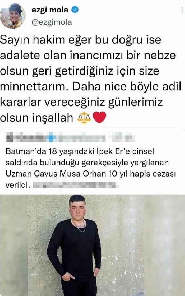 Siirt'te 18 yaşındaki İpek Er'e cinsel saldırıda bulunduğu iddiasıyla yargılanan eski Uzman Çavuş Musa Orhan, 10 yıl hapis cezası aldı. Sanık, cezası kesinleşinceye kadar tutuklanmayacak, adli kontrol ve yurt dışına çıkış yasağı uygulanacak. Oyuncu Ezgi Mola, karardan sonra hakime teşekkür etti.