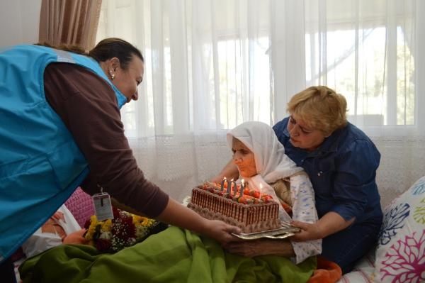 MUĞLA Eğitim ve Araştırma Hastanesi personelleri, 100 yaşına giren 5 çocuk, 8 torun sahibi Dudu Özpınar'a, evinde sürpriz doğum günü kutlaması yaptı.