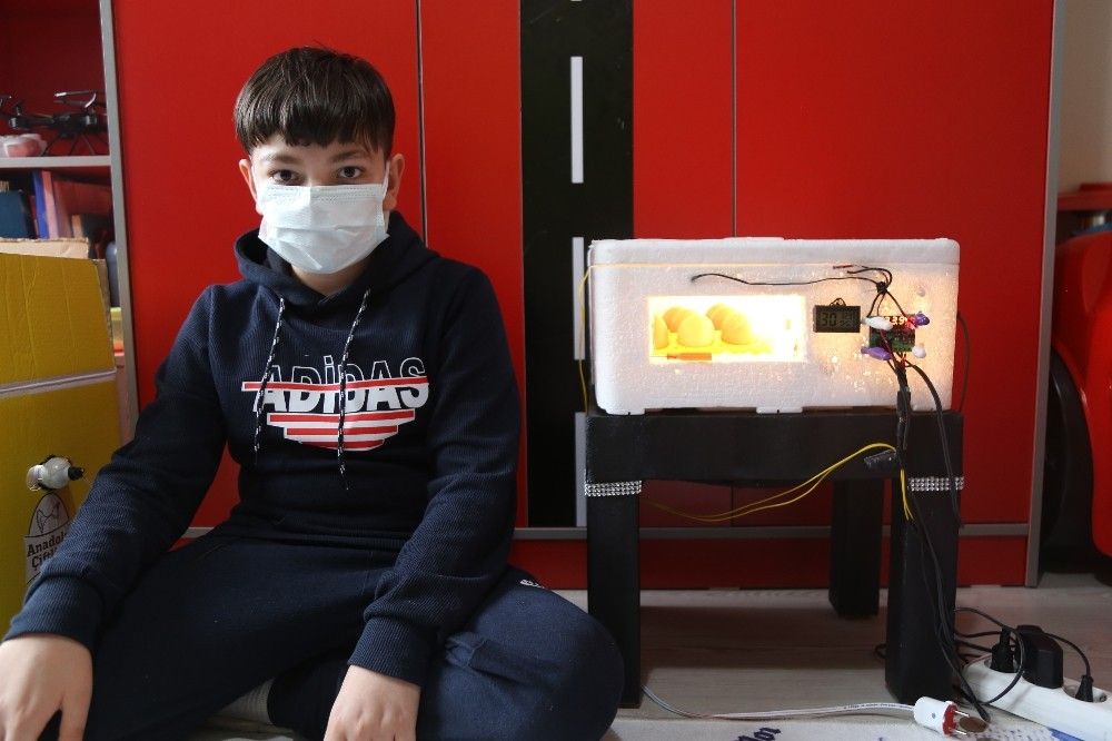Artvin'de annesi ve babası sağlık çalışanı olan, 11 yaşındaki 6. sınıf öğrencisi Yusuf Anıl Alpaydın, pandemi sürecinde uzaktan eğitiminden arda kalan zamanını kendi imkanlarıyla odasında yaptığı kuluçka makinesiyle civciv üretiyor.