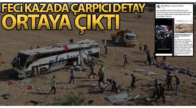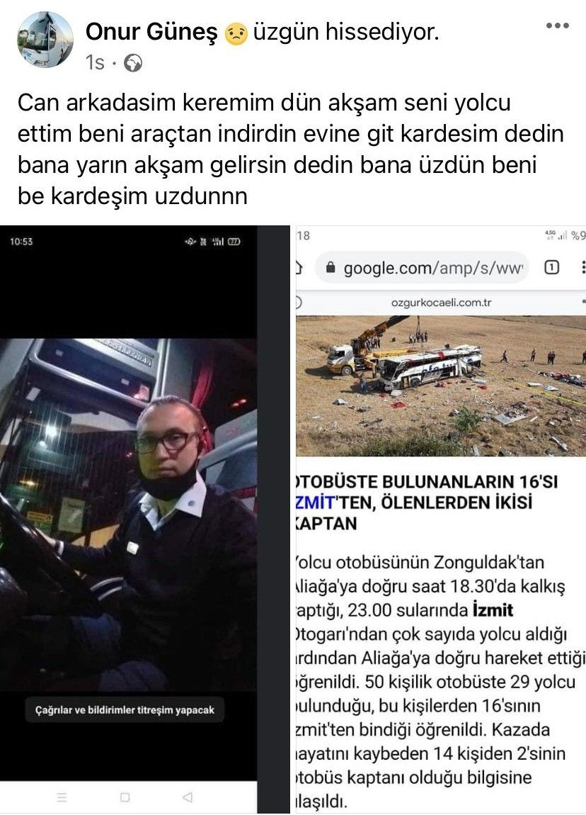 Zonguldak'tan İzmir'e gittiği sırada Balıkesir'de takla atan ve 15 kişinin öldüğü, 17 kişinin yaralandığı otobüs kazasında yeni detaylar ortaya çıktı. Otobüsün şoförleri Kerem Başol ile Cengiz Umut kazada yaşamını yitirdi. Sürücülerden Kerem Başol'un, seferi tamamlayacak olan şoför Onur Güneş'in yerine direksiyon başına geçtiği iddia edildi. Güneş'in rahatsızlanması üzerine Kerem Başol'un İzmir seferi için yola çıktığı öne sürüldü. Sosyal medya hesabından paylaşım yapan Onur Güneş, "Can arkadaşım Kerem; dün akşam seni yolcu ettim. Beni araçtan indirdin. Evine git kardeşim dedin. Bana yarın akşam gelirsin dedin. Üzdün beni kardeşim üzdün. Allah rahmet eylesin" ifadelerine yer verdi.