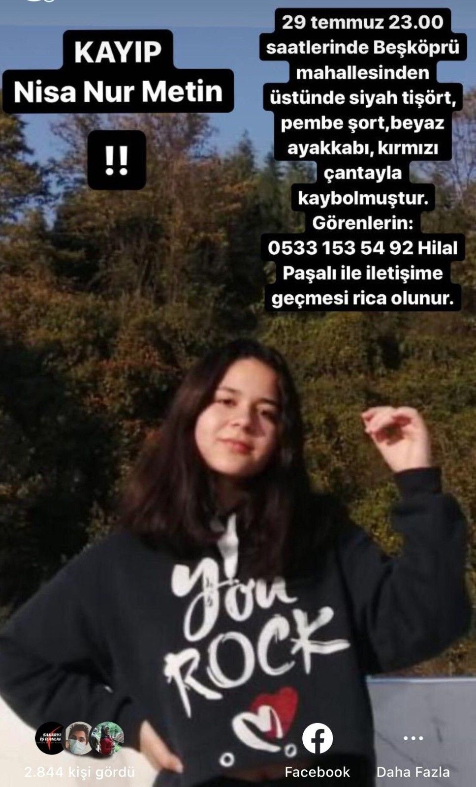 Serdivan ilçesi Beşköprü Mahallesi'nde dün evden çıkan 15 yaşındaki Nisa Nur Metin isimli kız çocuğu eve gelmeyince ailesi tedirgin oldu. Gece geç saatlere kadar bekleyen aile kızlarına ulaşamayınca durumu polis ekiplerine bildirdi. Ekipler, kız çocuğunu bulmak için çalışma başlatırken ailesi de sosyal medya hesaplarına kayıp ilanı verdi. Sosyal medyada verilen kayıp ilanında, "Kayıp Nisa Nur Metin. 29 Temmuz saat 23.00 saatlerinde Beşköprü Mahallesinden üstünde siyah tişört, pembe şort, beyaz ayakkabı ve kırmızı çantayla kaybolmuştur. Görenlerin iletişime geçmesi rica olunur" ifadeleri yer aldı.