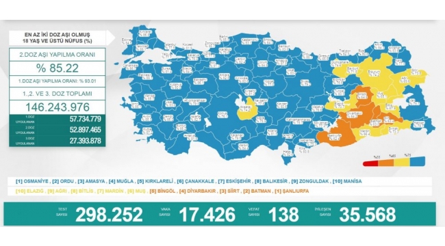 Sağlık Bakanlığı'nın açıkladığı 'Günlük Kovid- 19 Tablosu' verilerine göre; son 24 saatte yapılan 298 bin 252 testte 17 bin 426 vaka tespit edildi. Koronavirüs nedeniyle 138 kişi hayatını kaybederken, 35 bin 568 kişinin de tedavisi ve karantinası sona erdi. 18 yaş ve üzeri nüfusun aşılanması verilerinde 1'inci doz Türkiye ortalaması yüzde 93,01, 2'nci doz ortalaması yüzde 85,22 olarak ölçüldü. Ayrıca, 1'inci dozda 57 milyon 734 bin 779, 2'nci dozda 52 milyon 897 bin 465 ve 3'üncü dozda 27 milyon 393 bin 878 olmak üzere toplam 146 milyon 243 bin 976 aşı uygulandı.