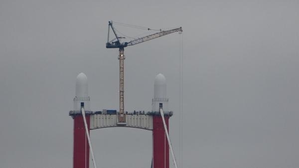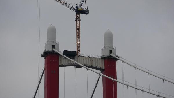 ÇANAKKALE Boğazı'nda Lapseki ve Gelibolu ilçeleri arasına inşa edilen 1915 Çanakkale Köprüsü'nün kulelerine, her biri 75 ton ağırlığındaki 4 top mermisi figürünün yerleştirme işlemleri tamamlandı.