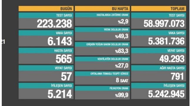 Sağlık Bakanlığının Covid-19 bilgilendirme sayfasında Türkiye'nin güncel korona virüs tablosu kamuoyuyla paylaşıldı. Tabloya göre son 24 saatte 57 kişi korona virüsten hayatını kaybetti, toplam can kaybı 49 bin 293'a yükseldi. Toplamda 58 milyon 997 bin 73 test yapıldı. Bugün yapılan 223 bin 238 testten, 6 bin 143 yeni vaka sayısı, 565 kişi de yeni hasta sayısı olduğu belirtildi. Toplam vaka sayısının 5 milyon 381 bin 736 olduğu, bugün iyileşen 5 bin 214 kişiyle birlikte toplam iyileşen hasta sayısının 5 milyon 242 bin 945'e yükseldiği, toplam hastalarda zatürre oranının yüzde 2,9, ağır hasta sayısının ise 791 olduğu açıklandı.