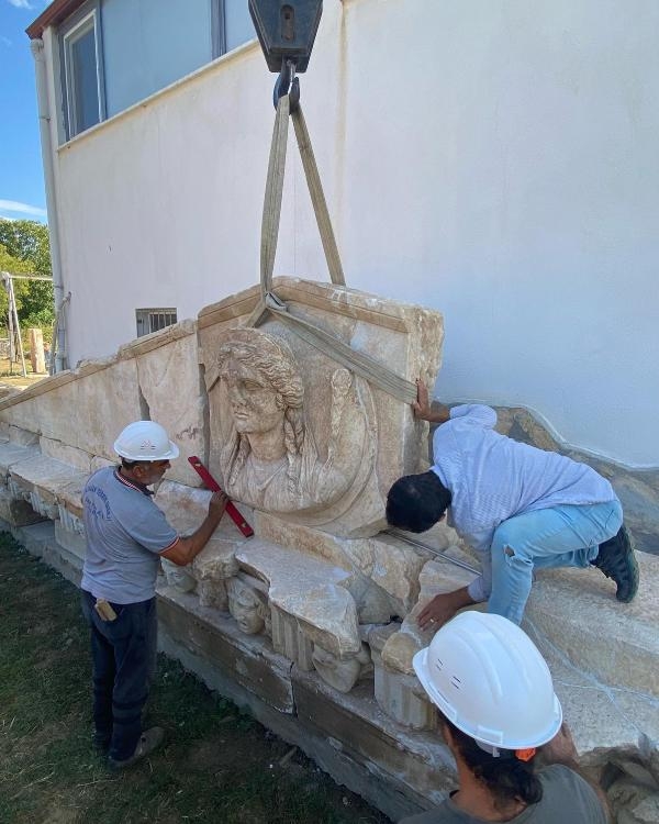 Muğla'nın Yatağan ilçesindeki Strakonikeia Antik Kenti'nde yürütülen kazı çalışmalarında bulunan Yunan tanrısı Dionysos'un eşi Ariadne'nin maskının arkeologlar ile restoratörler tarafından temizliği yapılıyor.