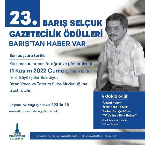 İzmir Büyükşehir Belediyesi tarafından 23'üncüsü düzenlenen Barış Selçuk Gazetecilik Yarışması için başvurular başladı. Barış Selçuk'un anısını yaşatmak ve genç gazetecileri teşvik etmek amacıyla düzenlenen Barış Selçuk Gazetecilik Ödülleri Yarışması'nda katılımcılar haber, fotoğraf ve görüntülerini, 11 Kasım'a kadar İzmir Büyükşehir Belediyesi Basın Yayın ve Tanıtım Şube Müdürlüğü'ne ulaştırabilecek.