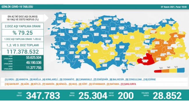 Sağlık Bakanlığı tarafından Türkiye'nin yeni korona virüs tablosu açıklandı. 7 Kasım'da açıklanan 24 saatlik verilere göre 25 bin 304 vaka tespit edildi. Virüs nedeniyle hayatını kaybedenlerin sayısı 200 oldu. Bir günde toplam 347 bin 783 test yapılırken, iyileşen hasta sayısı 28 bin 852 olarak kaydedildi. Sağlık Bakanlığı tarafından açıklanan tabloda, aşılama verilerine de yer verildi. En az 2 doz aşısını olmuş 18 yaş üzeri nüfusu kapsayan verilere göre Türkiye'de 2. doz aşılama ortalama yüzde 79,25 oldu. 1. doz ortalaması yüzde 89,62 olurken, 1., 2. ve 3. doz aşısını olan vatandaş sayısı toplamda 117 milyon 378 bin 532'e yükseldi.