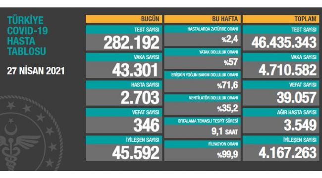Sağlık Bakanlığının Covid-19 bilgilendirme sayfasında Türkiye'nin güncel korona virüs tablosu kamuoyuyla paylaşıldı. Tabloya göre son 24 saatte 346 kişi korona virüsten hayatını kaybetti, toplam can kaybı 39 bin 57'e yükseldi. Toplamda 46 milyon 435 bin 343 test yapıldı. Bugün yapılan 282 bin 192 testten, 43 bin 301 yeni vaka sayısı, 2 bin 703 kişi de yeni hasta sayısı olduğu belirtildi. Toplam vaka sayısının 4 milyon 710 bin 582 olduğu, bugün iyileşen 45 bin 592 kişiyle birlikte toplam iyileşen hasta sayısının 4 milyon 167 bin 263'a yükseldiği, toplam hastalarda zatürre oranının yüzde 2,4, ağır hasta sayısının ise 3 bin 549 olduğu açıklandı.