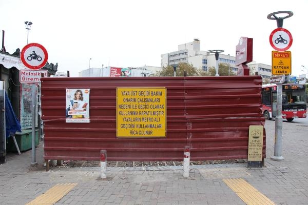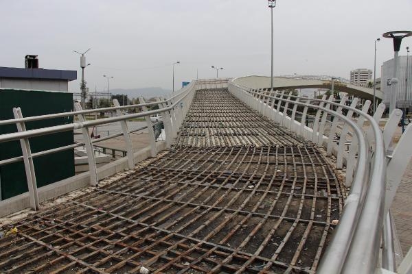 "Karayolları Bölge Müdürlüğü tarafından yaptırılan, sonrasında İzmir Büyükşehir Belediyesi'ne devredilen üst geçit, eğiminin fazla olması nedeniyle bazı sorunlar yaşanmasına neden olmakta, üzerinden motosiklet türü araçların geçmesi ise zemin kaplamalarının kırılmasına yol açmaktaydı. Belediyeye devredildikten sonra mevcut kaplamalar daha dayanıklı bir malzeme ile değiştirildi. Ancak eğim fazla olduğundan kayma şikayetleri arttı. Kaplamalar sökülerek üst geçit kapatıldı. Yayalar metro alt geçidine yönlendirildi. Geçidin yapım aşamasındaki handikapları ortadan kaldıracak yeni bir uygulama için çalışmalar başladı. İmalat olarak tabana sac döşenip, üstü MMA kaplama olarak anılan bir uygulama ile kaplanacak. Kullanılacak sacların atölye imalatları devam ediyor. Ardından montaj işlemine başlanacak. Aralık ayı sonuna kadar üst geçidin yaya trafiğine açılması planlanıyor." (DHA)