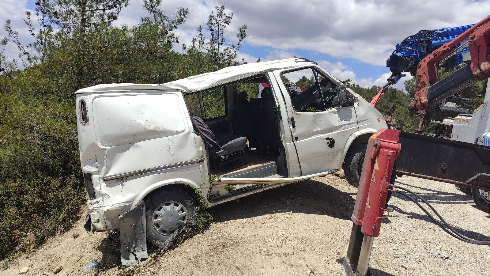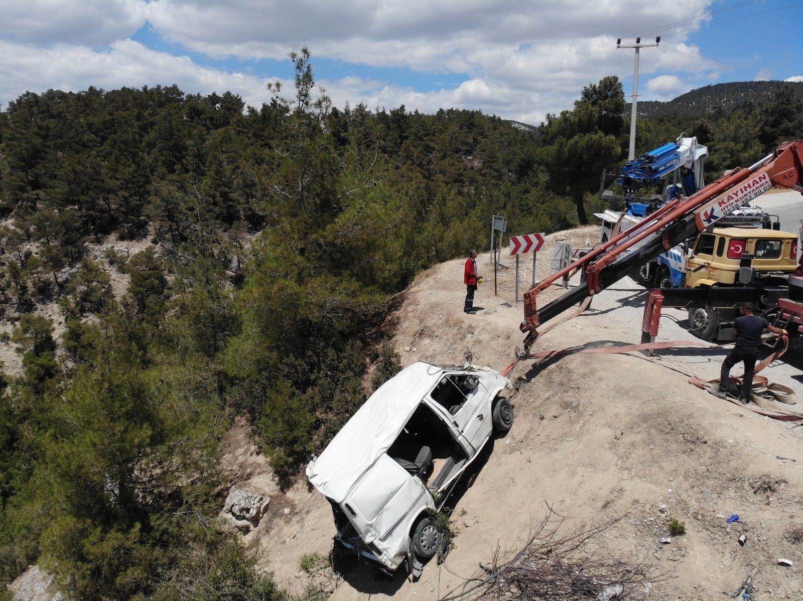 Denizli'de duraklayan araca minibüsün çarpması sonucu 3 kişinin öldüğü, 5 kişinin ise yaralandığı kazadaki araçlar, vinç yardımı ile uçurumdan çıkartıldı.