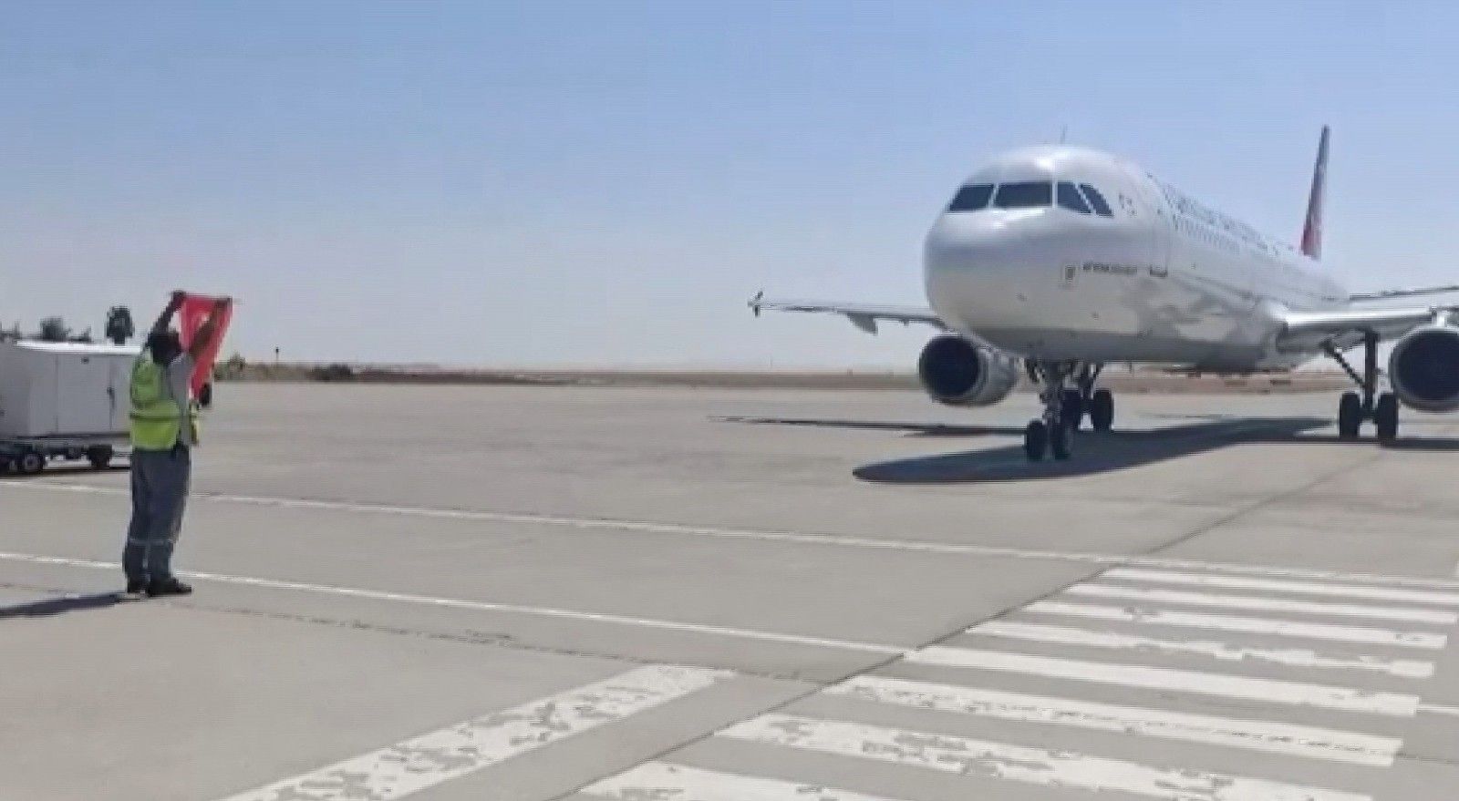 Adıyaman Havalimanı'na iniş yapan yolcu uçağı, 30 Ağustos Zafer Bayramı dolayısıyla pist görevlisi tarafından Türk bayrakları ile karşılandı.