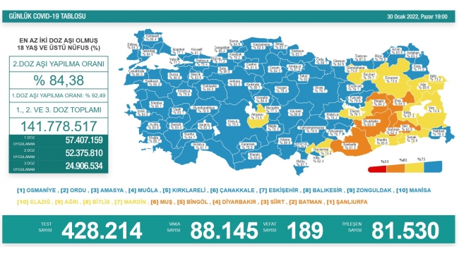 Buna göre; Türkiye'de son 24 saatte 428 bin 214 Kovid-19 testi yapıldı, 88 bin 145 kişinin testi pozitif çıkarken, 189 kişi ise hayatını kaybetti.