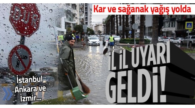 Meteoroloji Genel Müdürlüğü'nün internet sitesinde yer alan hava durumu tahmin raporuna göre; aralarında İstanbul'un da olduğu 34 il için sağanak uyarısı yapıldı. Hava durumu tahmin raporuna göre; Kastamonu ve Erzurum dahil 6 il için karla karışık yağmur uyarısı yapıldı.