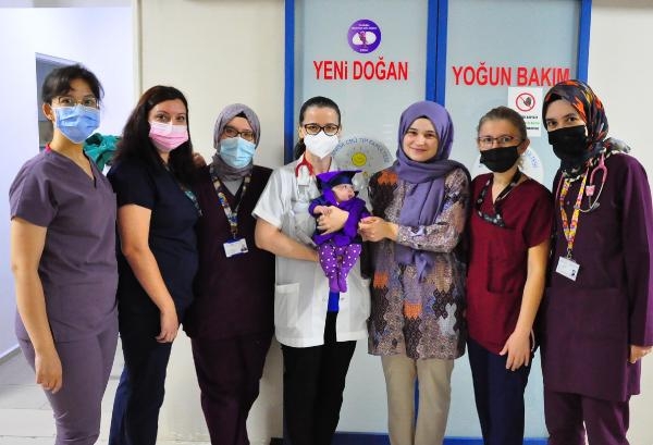 Manisa'nın Akhisar ilçesinde Büşra Kahraman (23), 22 haftalık hamileyken, geçen yıl 7 Aralık'ta yüksek tansiyon nedeniyle hastaneye başvurdu. Gebelik zehirlenmesi yaşadığı tespit edilen Kahraman, acil olarak Manisa Celal Bayar Üniversitesi Hafsa Sultan Hastanesi'ne sevk edildi. Hemen doğuma alınan Kahraman, sezaryenle kız çocuğunu dünyaya getirdi. 390 gram doğan ve yaşamasının çok zor olduğu belirtilen bebek, hastanenin yenidoğan yoğun bakım ünitesinde tedaviye alındı. Beyin ve akciğer kanaması geçiren, solunum sıkıntısı yaşayan bebek, yoğun bakımdaki 6 ay süren yaşam mücadelesini kazanarak hayata tutundu. 20 gün önce servise alınan ve yaşamasının mucize olması nedeniyle Mucize ismi verilen bebek, 3 kilo 550 grama ulaştı. Hayati fonksiyonları normale dönen Mucize Kahraman'ın yaşama tutunması ailesi Büşra-Sercan Kahraman çiftini, doktor ve hemşireleri sevince boğdu. Mezuniyet kıyafeti giydirilen Mucize bebek, kendisini tedavi eden doktor ve hemşireler tarafından alkışlarla taburcu edildi.