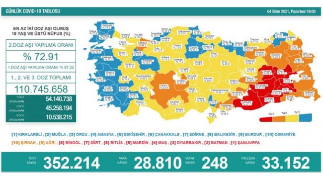 Güncel verilere göre, birinci doz Türkiye ortalaması yüzde 87.22, ikinci doz ortalaması yüzde 72.91, birinci, ikinci ve üçüncü doz toplamı ise 110 milyon 745 bin 658 oldu.