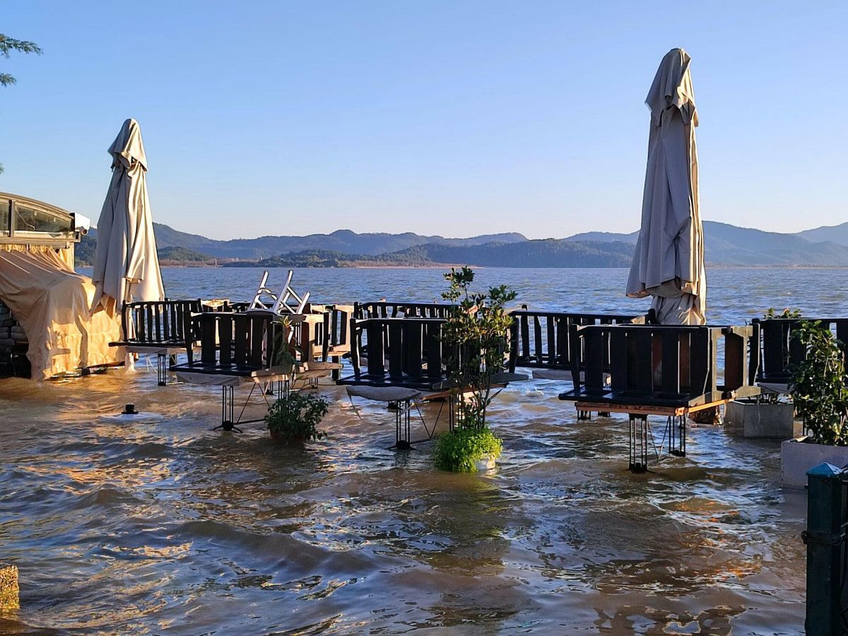 Muğla'da etkili olan sağanak nedeniyle taşan Köyceğiz Gölü'nün kenarındaki restoran ve kafeleri su bastı. İşletmeciler, sular altında kalan masa ve sandalyeleri kurtarmak için seferber oldu.