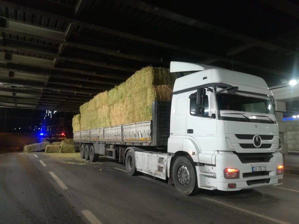İzmir'in Konak ilçesinde saman yüklü TIR 4 metre yükseklikteki alt geçide sıkıştı. Sıkışma nedeniyle samanlar yola saçıldı.