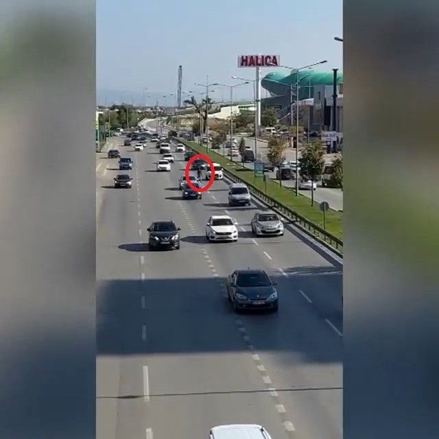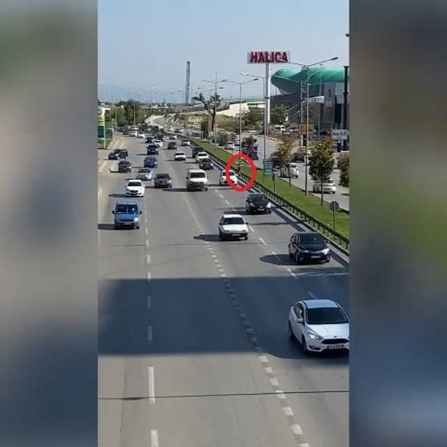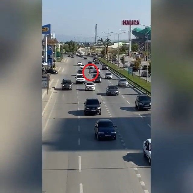 Bursa'da 4 şeritli otoyolda hızla ilerleyen araçların arasında bir kişinin yürümeye çalıştığını görenler gözlerine inanamadı. Yolun karşısına geçmeden refüjden geri dönen kişi, kendi ve sürücülerin canını adeta hiçe saydı.