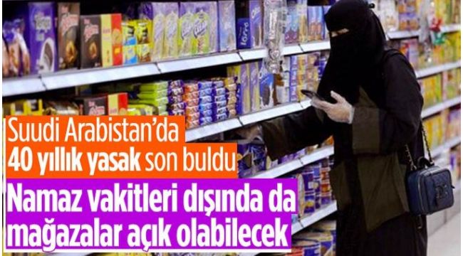 Suudi Arabistan yönetimi, 40 yıllık yasağa son vererek mağazaların namaz vakitlerinde de açık kalmasına ve ticari faaliyette bulunmaya izin verdi.