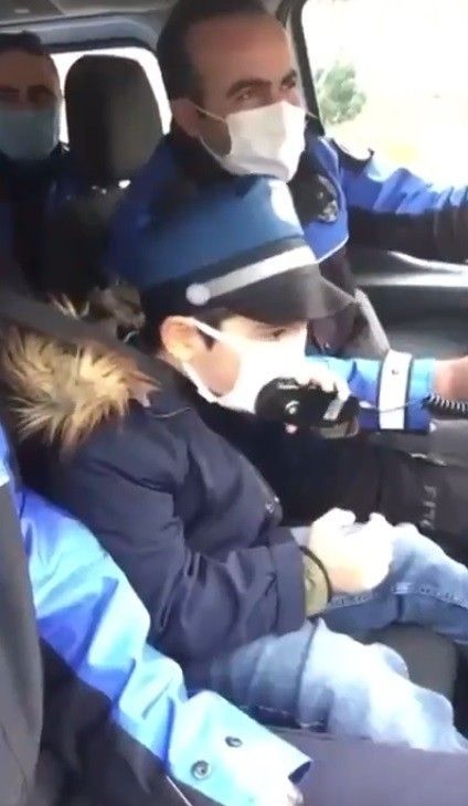 Trabzon'da 5 yaşındaki Aras Yavuz'un polis olma hayali gerçekleştirildi. Minik Aras, polis üniformasıyla bindiği ekip aracından çocuklara "Maskesiz oynamayın" anonsu yaptı.