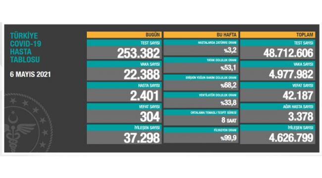 Sağlık Bakanlığının Covid-19 bilgilendirme sayfasında Türkiye'nin güncel korona virüs tablosu kamuoyuyla paylaşıldı. Tabloya göre son 24 saatte 304 kişi korona virüsten hayatını kaybetti, toplam can kaybı 42 bin 187'e yükseldi. Toplamda 48 milyon 712 bin 606 test yapıldı. Bugün yapılan 253 bin 382 testten, 22 bin 388 yeni vaka sayısı, 2 bin 401 kişi de yeni hasta sayısı olduğu belirtildi. Toplam vaka sayısının 4 milyon 977 bin 982 olduğu, bugün iyileşen 37 bin 298 kişiyle birlikte toplam iyileşen hasta sayısının 4 milyon 626 bin 799'e yükseldiği, toplam hastalarda zatürre oranının yüzde 3,2, ağır hasta sayısının ise 3 bin 378 olduğu açıklandı.