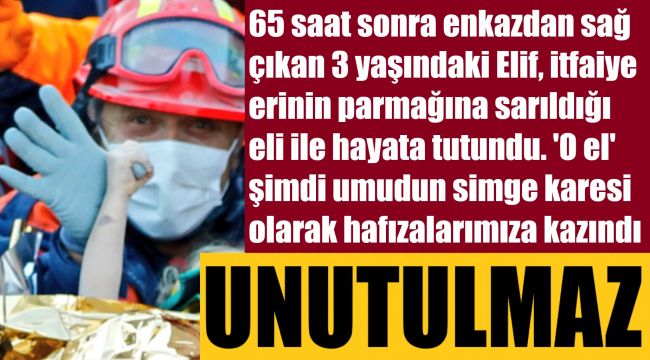 Elif Perinçek... 3 yaşındaki cılız bedeni ile sığındı yaşam üçgeninde azraile 65 saat direndi. Onu buldular. Önce gözlerini açtı, sonra kahramanı olan itfaiye erinin parmağına öyle bir sarıldı ki; tüm ülkeyi sevinç gözyaşlarına boğdu, 'umudun' simge fotoğrafı oldu
