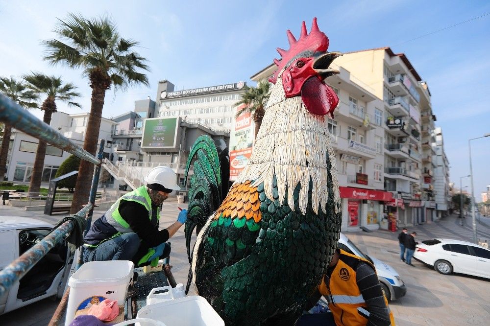 Sokağa çıkma kısıtlamasını fırsat bilen Denizli Büyükşehir Belediyesi, 7 bin parçadan oluşan kentin simgesi dev cam horoz heykelinde bakım ve temizlik çalışması yaptı.