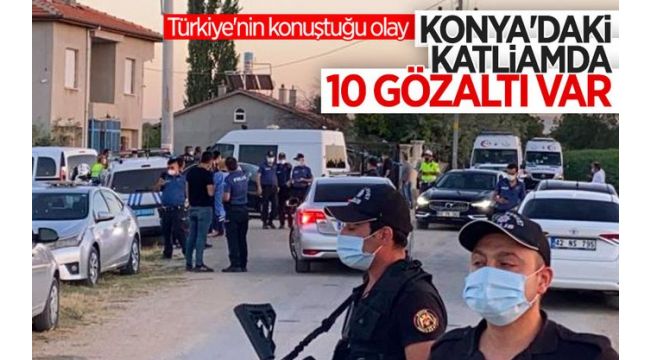 Konya'da dün akşam saatlerinde düzenlenen silahlı saldırıda aynı aileden 7 kişinin katledildiği olayla ilgili 10 kişinin gözaltına alındığı, olayı gerçekleştiren ve firar eden bir kişinin de yakalanması için çalışmaların devam ettiği bildirildi.