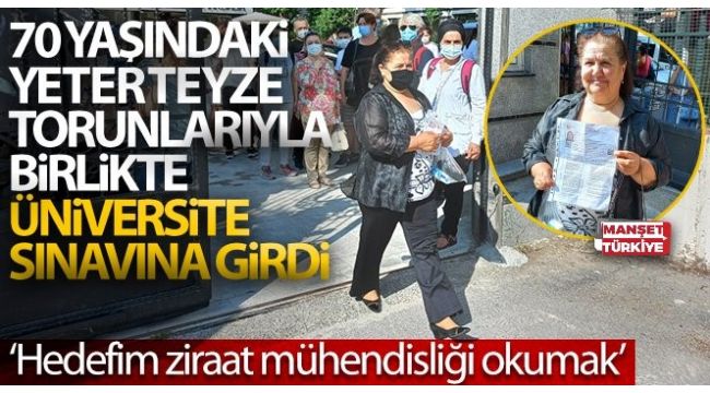 Türkiye genelinde düzenlenen Yükseköğretim Kurumları Sınavı'nın (YKS) ilk oturumu olan Temel Yeterlilik Testi (TYT) bugün yapıldı. Sonuçları üniversiteye girişte kullanılacak sınav, farklı görüntülere sahne oldu. Sınava girenler arasında en dikkat çekeni torunlarıyla sınava gelen 70 yaşında Yeter Gül oldu. Ortaokulda eğitim hayatına ara veren Gül, 64 yaşından sonra eğitim hayatına devam etme kararı aldı. Açık öğretimle önce ortaokulu ardından liseyi bitiren Yeter Gül, üniversite okumaya karar verdi ve torunlarıyla beraber üniversite sınavına girdi.