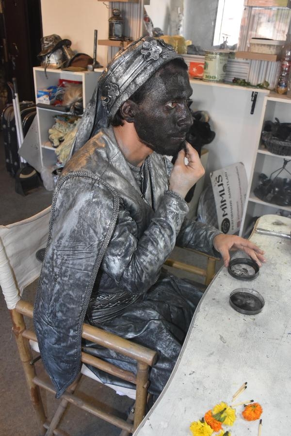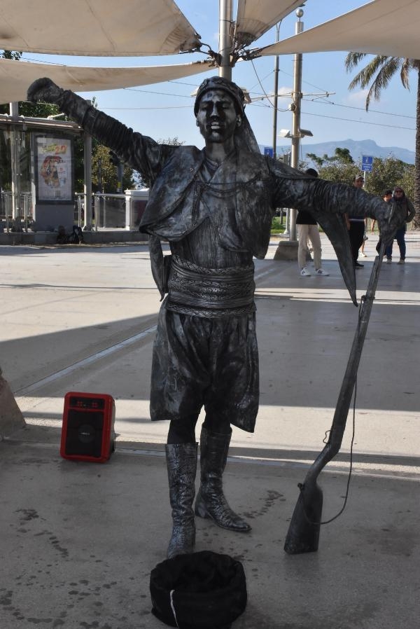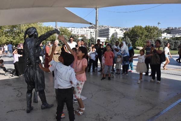 Canlı heykele dokunan Sibel Udül (8) ise "Heykel sandım, birden hareket edince çok şaşırdım" dedi. (DHA)