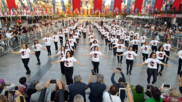 Aydın'da, Kadın hakları Koruma Derneği, Cumhuriyetin 99'uncu yıl dönümü kutlamaları kapsamında Atatürk Kent Meydanı'nda 99 kadını bir araya getirdi. 2 ay boyunca prova yapan 99 kadın, Kent Meydanı'nda Cumhuriyetin 99'uncu yılında zeybek gösterisi sundu. Makyajla Ulu Önder Mustafa Kemal Atatürk'e benzetilen bir kişinin de tek başına oynadığı zeybek gösterisi renkli görüntüler oluşturdu ve uzun süre alkış aldı. Gösteri sonrası zeybek oynayan kadınlar, ellerinde Türk bayraklarıyla, makyajla Atatürk'e benzetilen kişi ile fotoğraf çektirdi. Gösteri sonrası alanı dolduranlar, 29 Ekim Cumhuriyet Bayramı'nı coşkuyla kutladı.