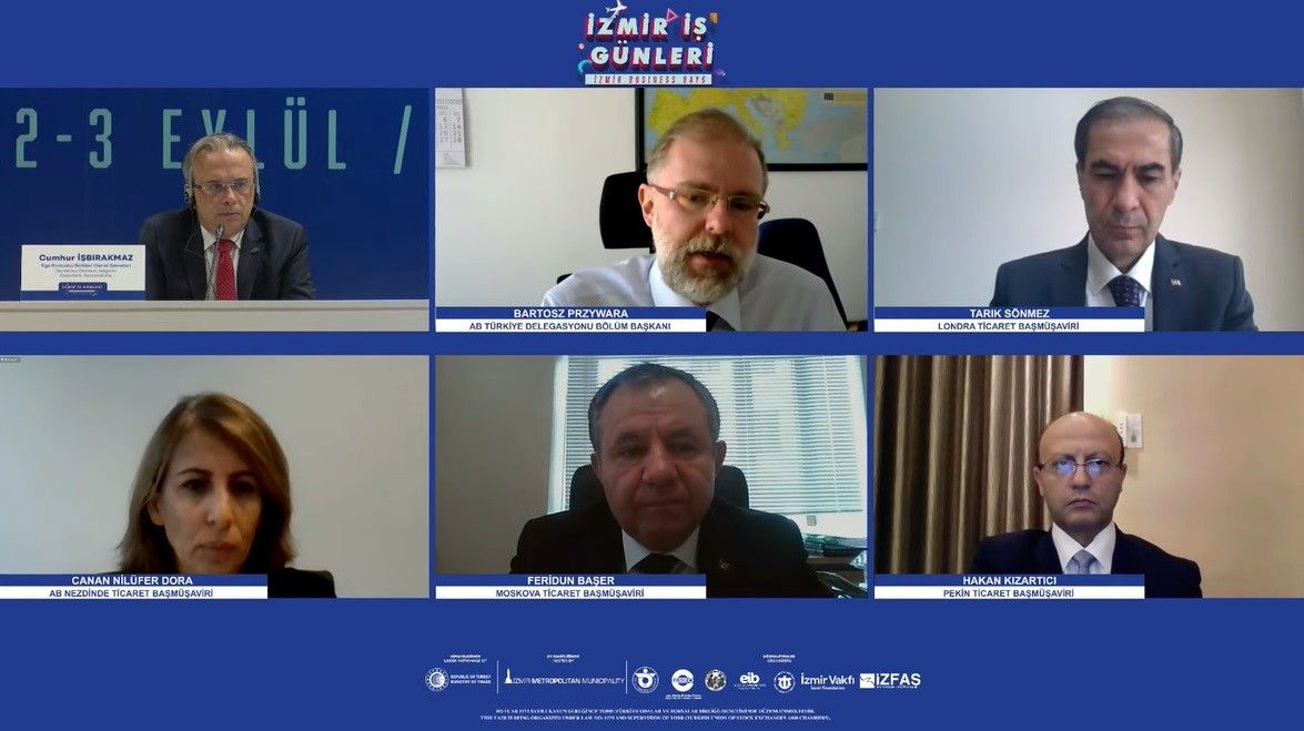 "Ticaretin Geleceği: Güncel Gelişmeler" webinarı; AB Türkiye Delegasyonu Ticaret ve İktisadi Bölüm Başkanı Bartosz Przywara, AB Nezdinde Ticaret Başmüşaviri Canan Nilüfer Dora, Londra Ticaret Başmüşaviri Tarık Sönmez ve Moskova Ticaret Başmüşaviri Feridun Başer'in katılımlarıyla Ege İhracatçı Birlikleri Genel Sekreteri Cumhur İşbırakmaz'ın moderatörlüğünde gerçekleşti.