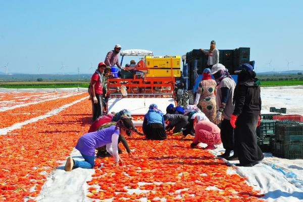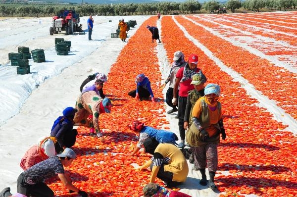 Türkiye'de sanayi tipi domates üretiminde 2'nci sırada yer alan, kurutulmuş domatesin de önemli merkezlerinden Manisa'nın Saruhanlı ve Turgutlu ilçelerinde hasat edilen ürünler, kurutulmak için tarlalara serilmeye başlandı. Tarlada işçilerin topladığı domatesler, makineyle güneşe seriliyor. Tuzlama işleminin ardından 1 hafta boyunca kurumaya bırakılan domatesler, daha sonra tesislere getirilerek işleniyor. İhracatçı firmalara kilogramı 35 ile 40 TL arasında verilen kurutulmuş domatesler, ABD başta olmak üzere İngiltere, İtalya, Almanya ve Rusya'ya gönderiliyor. Bu yıl kurutulmuş domateste 15 bin tonluk ihracat hedefleniyor.